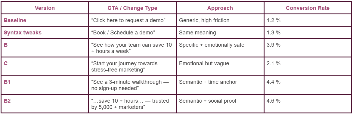 Interpretation: Once the CTA reflected a felt benefit (relief, time back) and invited low-pressure exploration, engagement tripled. Semantics outperformed syntax — emotion outweighed structure.
